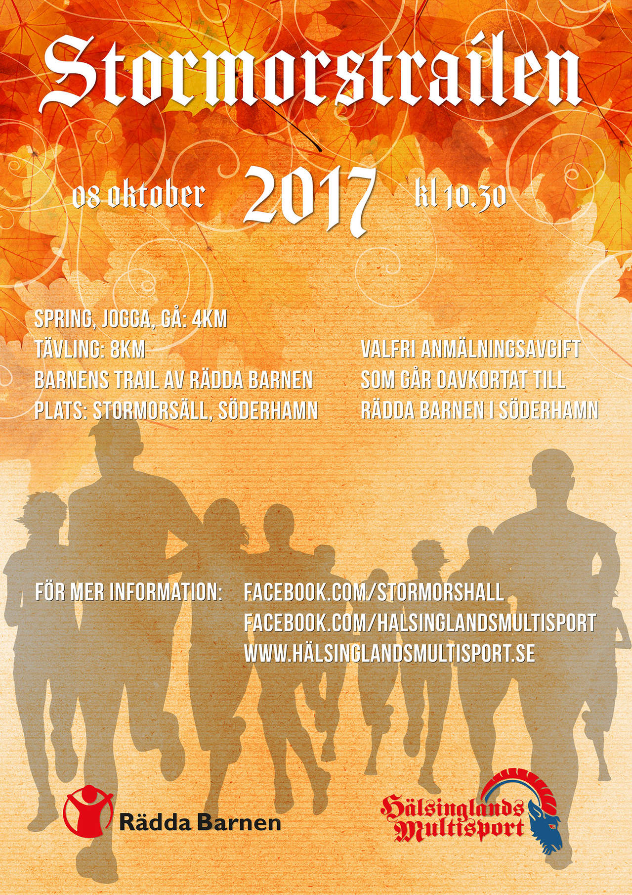 Även om själva eventet Stormorstrailen är Daniel Rönströms idé så är banan min lilla bebis. En bana som har lite av allt och passerar självklart över både rullstensåsen och själva Stormorshällen. Nu är det 3:e året som vi tillsammans med Rädda Barnen i Söderhamn anordnar Stormorstrailen där varenda krona av den frivilliga anmälningsavgiften går till just Rädda Barnen i Söderhamn.